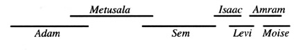 Linii trase la scară, aratând suprapunerea celor 930 de ani ai lui Adam, 969 ai lui Metusalem, 600 ai lui Sem, 180 ai lui Isaac, 137 ai lui Levi, 137 ai lui Amram și 120 ai lui Moise.