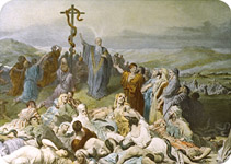 Israeliții au fost atacați de o plagă, a „șerpilor veninoși”. Prin îndrumare divină Moise a făcut un șarpe de aramă și l-a ridicat pe o prăjină. Israeliților li s-a spus să se uite la acel șarpe ca să fie vindecați. „Șerpii veninoși” reprezintă păcatul care a adus moartea. Dumnezeu a făcut prin răstignirea lui Cristos pregătiri de viață pentru lumea mușcată de păcat. El a fost tratat ca păcătos, pentru ca păcătoșii să poată fi eliberați din păcat și moarte.